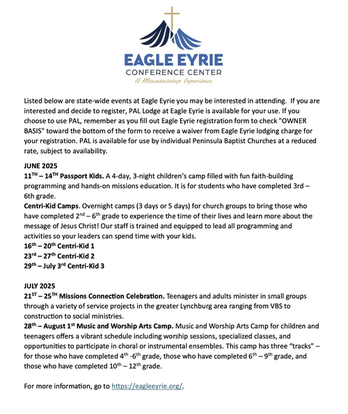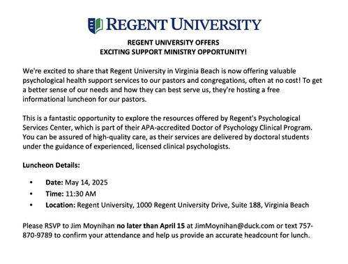 you have need of someone to speak or are looking for an Interim Pastor while searching for a pastor, please check out our list on our website www.thepeninsulanet.org, under “Resources”. Also, if you would like to be added to the list either as a Supply Preacher or Interim Pastor, please contact us.