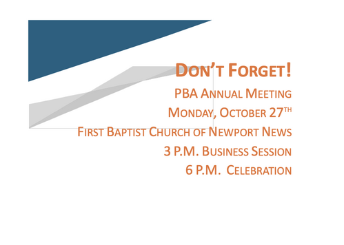 The Business Session will be followed at 6 P.M. by a service of Worship and Celebration. Details of this meeting are being kept under wraps to avoid disclosing any surprises. It will include a time of looking back over the time Chuck has been our director, and a time of looking to the future of the PBA.